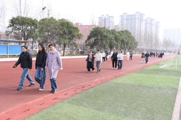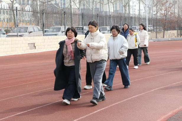 活动中女教师们脸上洋溢着笑容,步履轻快地行走在洒满阳光的运动场上,暂时放下繁忙工作,三五成群结伴而行,或奋勇争先,或畅谈交流,欢声笑语尽显乐观进取的精神风貌。春日暖阳下,大家在健步中舒展身心、增进情谊,既践行了健康生活理念,也增强了团队凝聚力与向心力。