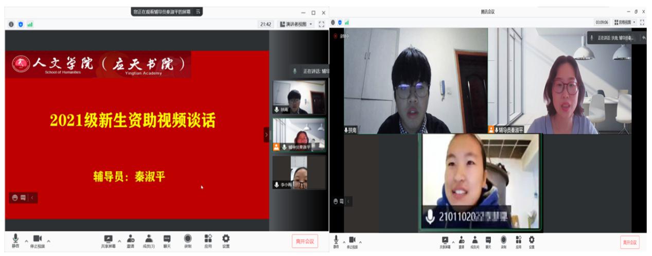 秦老师通过对前一阶段提交申请同学材料进行了详细阅读,针对表述不清或关系不明的地方进行了详细询问和了解,并致以真切的关心和关怀。高年级学长协助做好谈话记录工作。通过视频面谈,学院不仅深入了解掌握了申请同学的家庭情况,而且对接下来助学金评议工作顺利开展提供了更详实的资料和指导。