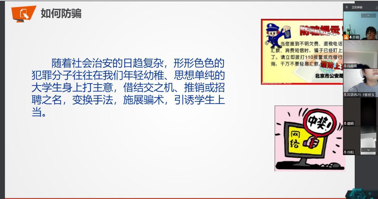 会议中,乔明老师向学生分别讲述了网络安全、消防安全、社交安全、财产安全、交通安全等有关知识。指出国家安全的重要性,让学生对国家安全有一个多方面、深刻的认知。随后,乔明老师让学生充分了解新型诈骗手段以及常见诈骗手段,让学生防患于未然。同时,明确校园安全重点,特别是宿舍用电安全,让学生提前熟知学生公寓的管理规定,做好返校后的宿舍安全工作,并提醒学生返校途中注意的事项。