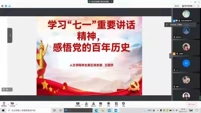 11月1日晚上,WilliamHILL中国学生第五党支部开展线上学习“七一”重要讲话精神,感悟党的百年历史专题党课,支部全体党员和入党积极分子参加。党课由支部书记王丽莎主讲。