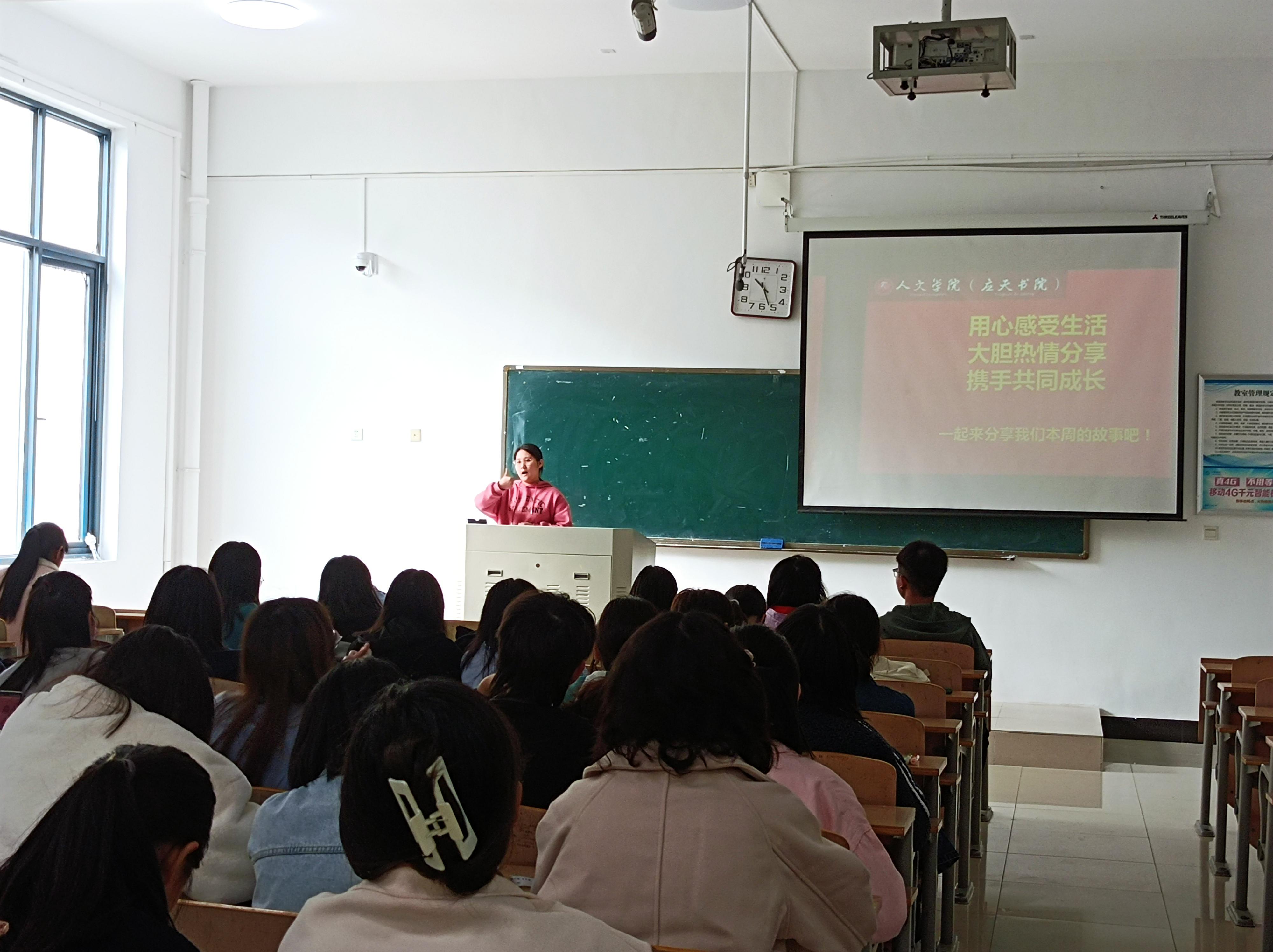 活动伊始,同学们各展其才,分享自己的学习、生活、阅读书籍等方面的收获与感悟;分享自学的知识、手语、歌曲、乐器、校园跑等方面的心得体会;分享自己在校园里参加的各种丰富多彩PU活动,展示自己一周的精彩生活。