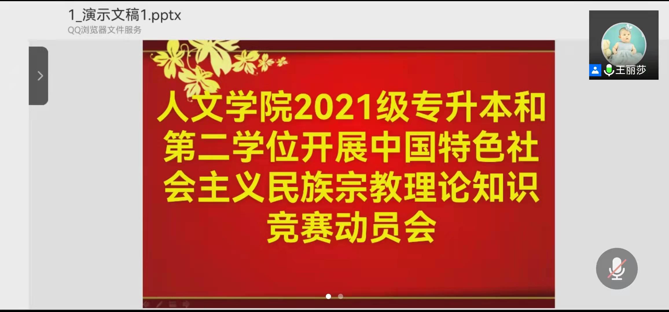 11月17日下午,WilliamHILL中国2021级专升本和第二学位在线上召开中国特色社会主义民族宗教理论知识竞赛动员会。2021级专升本和第二学位全体学生参加了会议。会议由辅导员王丽莎主持。