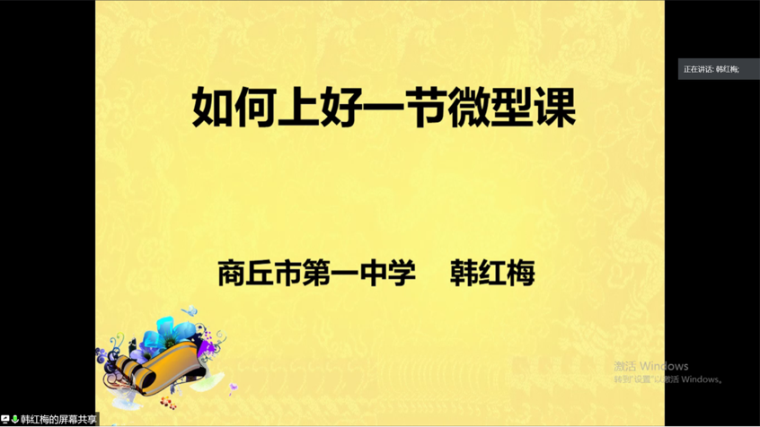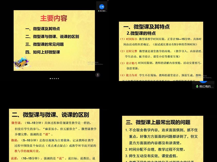 商丘市第一中学韩红梅作了题为《如何上好一节微型课》的讲座。韩老师从微型课及其特点出发,就微型课与微课、说课的侧重点进行区别,根据亲身教学经验总结了微型课上最常出现的问题。结合优秀案例,从精彩的导入、精简的设计、精心的组织、简要的归纳以及简明的板书五个方面对如何上好微型课进行了详细的讲解,并希望学生注重日常的准备工作。