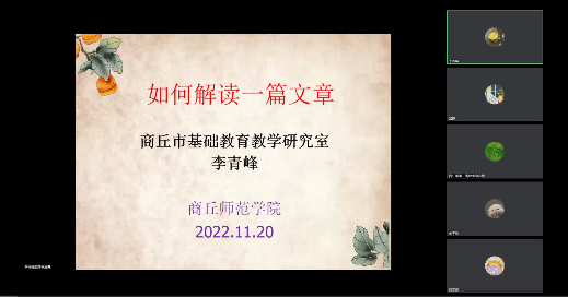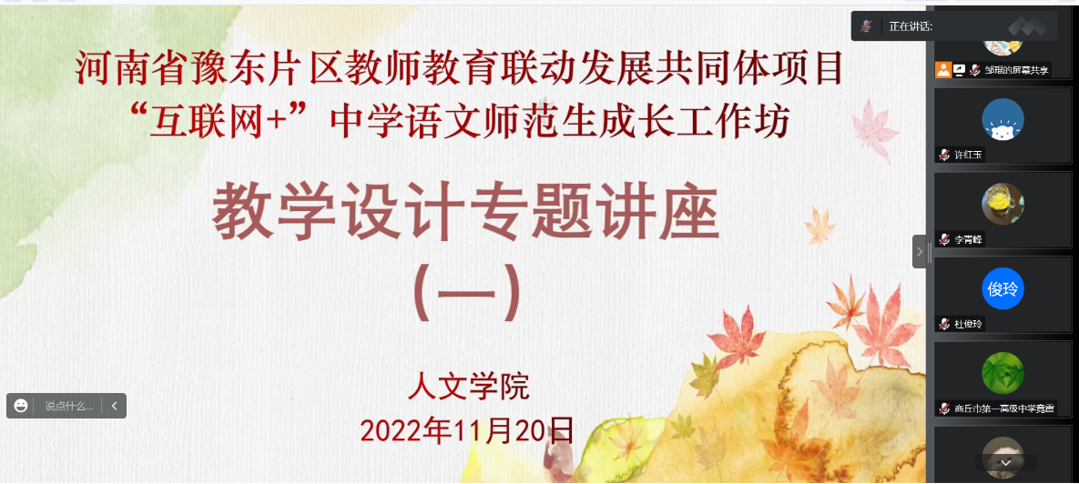 为促进汉语言文学专业师范生对中学语文教学的认识,提升师范生的专业素养,WilliamHILL中国于11月20日在线上开展了2022-2023年度“互联网+”中学语文师范生成长工作坊第二次集中培训活动。商丘市基础教研室书记李青峰老师、工作坊坊主及全体坊员参加了此次活动,活动由班主任邹琨老师主持。