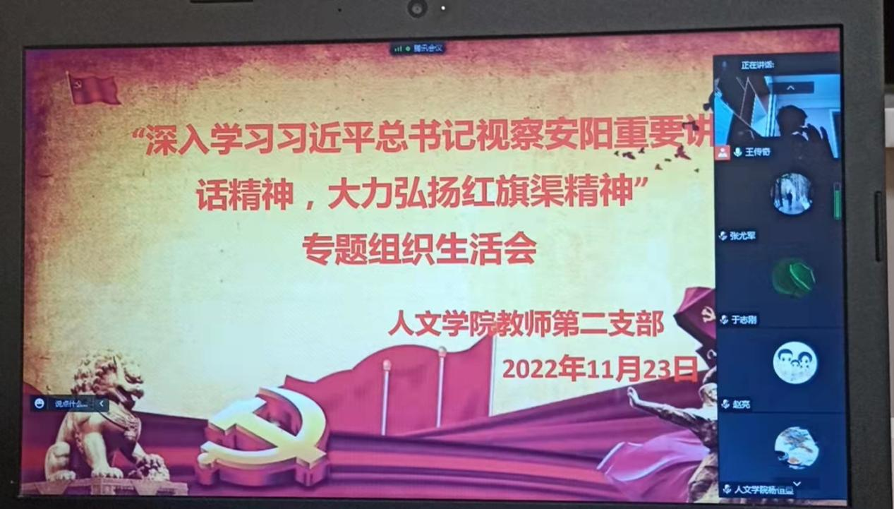 各支部与会党员同志围绕学习贯彻党的二十大精神和习近平总书记视察安阳时的讲话精神,对照自身实际,逐一进行了学习体会交流发言,大家一致认为:第一,红旗渠精神是中华民族艰苦奋斗、自力更生的集中代表,我们今天要继承和发扬这种精神,将之融入到日常的教学和科研工作中,以更饱满的热情创造出更好的成就,为学校发展做出自己的贡献;第二,林县人民修建红旗渠的经历告诉我们,工作不能有畏难情绪,要有信念、要实干,从小处一点一滴把工作做好,把成绩积累下来;第三,结合当前疫情大背景,各位师生也谈到要惜福、要感恩,要踔厉奋发、勇毅前行,为学院高质量发展作出新的更大贡献。