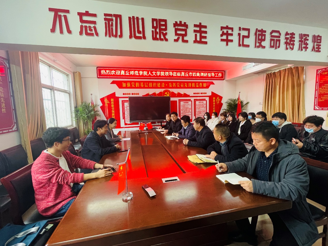 商丘市第四高级中学党委书记李晨,校长苗军、副校长邵红卫及教师代表接待了高建立一行。李晨首先对高建立一行表示热烈欢迎,并介绍了商丘市第四高级中学基本情况与办学优势特色;苗军校长介绍了高中历史师资与教学概况,苗军表示,在“3+1+2”高考改革新形势下,历史学科愈来愈受师生重视,师资需求也不断增加,希望今后能够加强与我院历史系的交流合作,补充学校师资力量。高建立对商丘市第四高级中学的热情接待表示感谢,鼓励实习生要珍惜实习机会,遵守实习纪律,向一线教师学习教学方法与经验,圆满完成实习任务,切实提升教学能力,为将来零距离就业打下坚实基础。