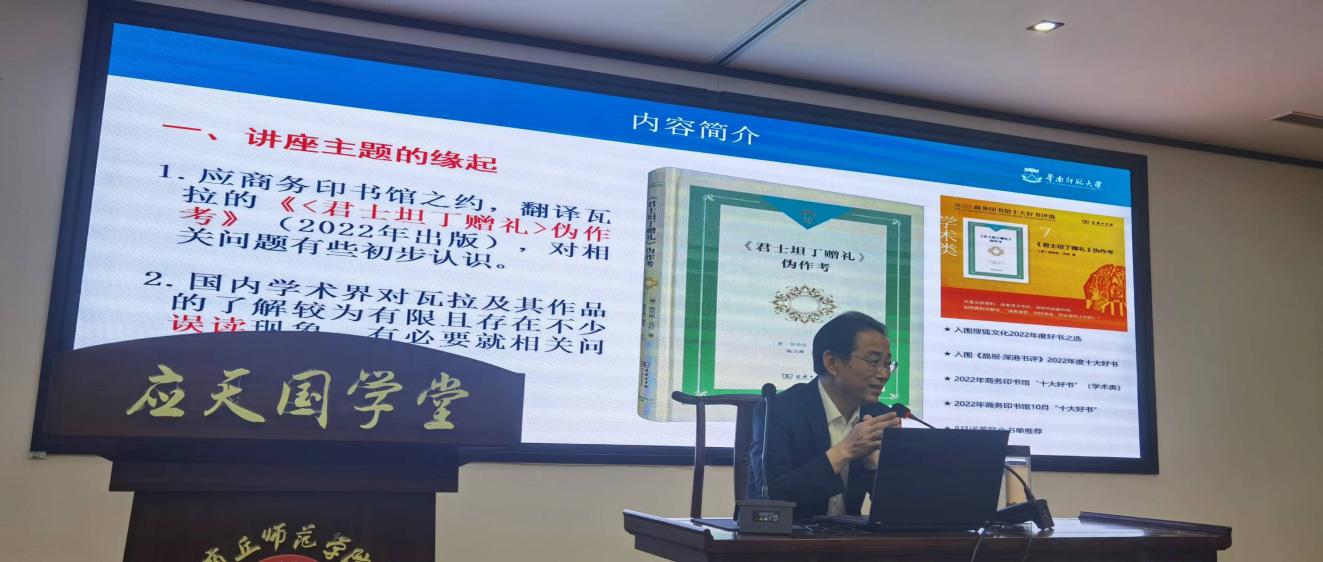 陈文海教授结合自身世界史的学习、研究经验,向我院师生展示了近年来关于《<君士坦丁赠礼>伪作考》的研究成果。整场讲座充满了浓厚的学术氛围,使在场师生享受了一场精彩的学术盛宴。 报告内容深入浅出,独到的语言,精辟的讲解,参与人员认真学习并就有关问题进行探讨。