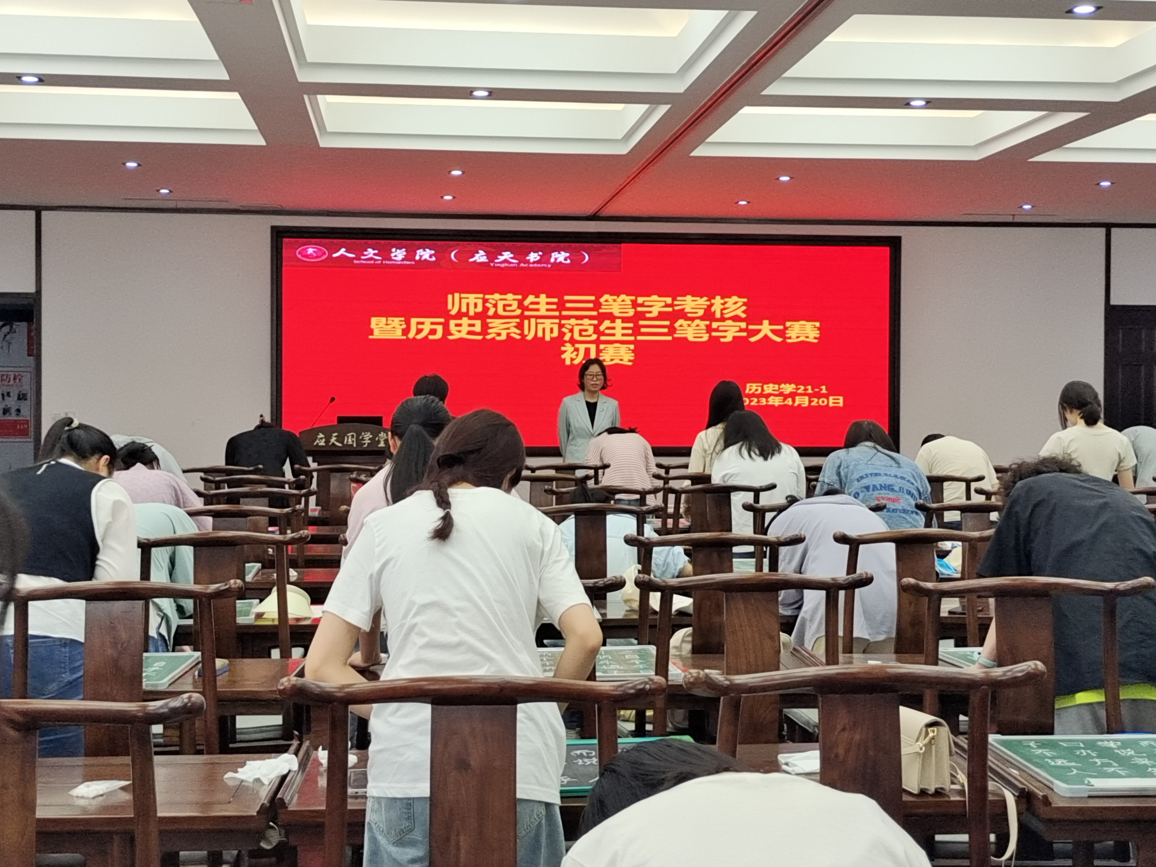 4月20日,WilliamHILL中国师范生三笔字考核暨历史系师范生三笔字大赛初赛如期举行。本次比赛在汉梁楼国学堂举行,历史学21-1班全体同学参加本次比赛,辅导员秦淑平老师到场指导。