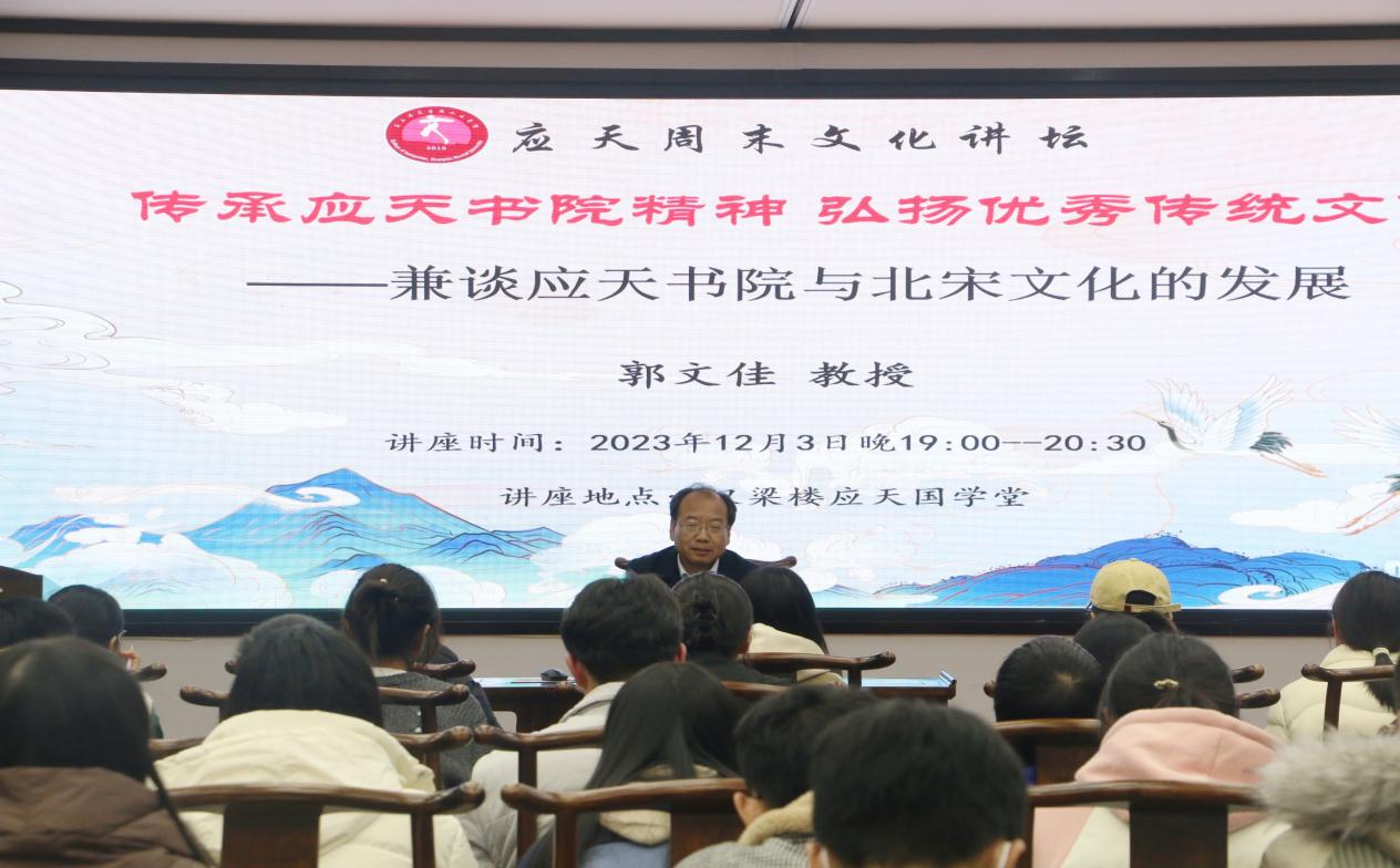 随后,郭文佳教授围绕着“应天书院的建立和发展”、“为北宋培养了大批人才”、“开启北宋理学思潮,奠定宋代学术基础”、“传承应天书院精神,弘扬优秀传统文化”等维度展开。讲座开篇从杨悫、戚同文等历史上著名的大家对应天书院的建立和发展展开讲述,同时还探讨了“为何应天书院被称为四大书院之首”。郭文佳教授还重点介绍了“范仲淹与应天书院相互成就的佳话”,他积极提倡复兴儒学,兴学育才,开启了北宋理学的思潮、奠定了宋代学术的基础。
