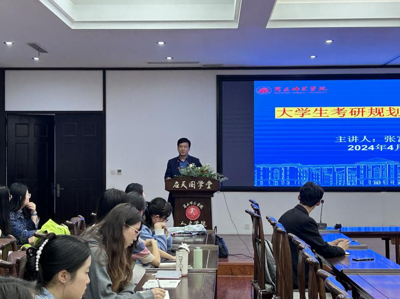 随后,张富林老师开门见山、以幽默诙谐的语言和大家打成一片,向大家讲解了考研的优势和重要性;同时通过市场需求等数据,清晰地向大家展示了当今市场对本科生与研究生的需求,本科生与研究生就业现状的区别。在分享到考研的院校选择、时间规划、复试技巧及调剂案例时,张老师向同学们介绍了近年的考研趋势,并提出:要遵循数据原则、保底原则、双保险原则,强调“备考效率=时间充足+正确方向+充分努力”。